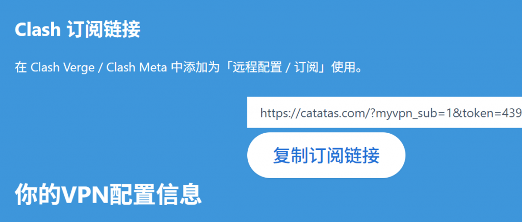 - 登录你购买服务的账户,在「我的vpn配置信息」页面找到订阅链接(URL)。